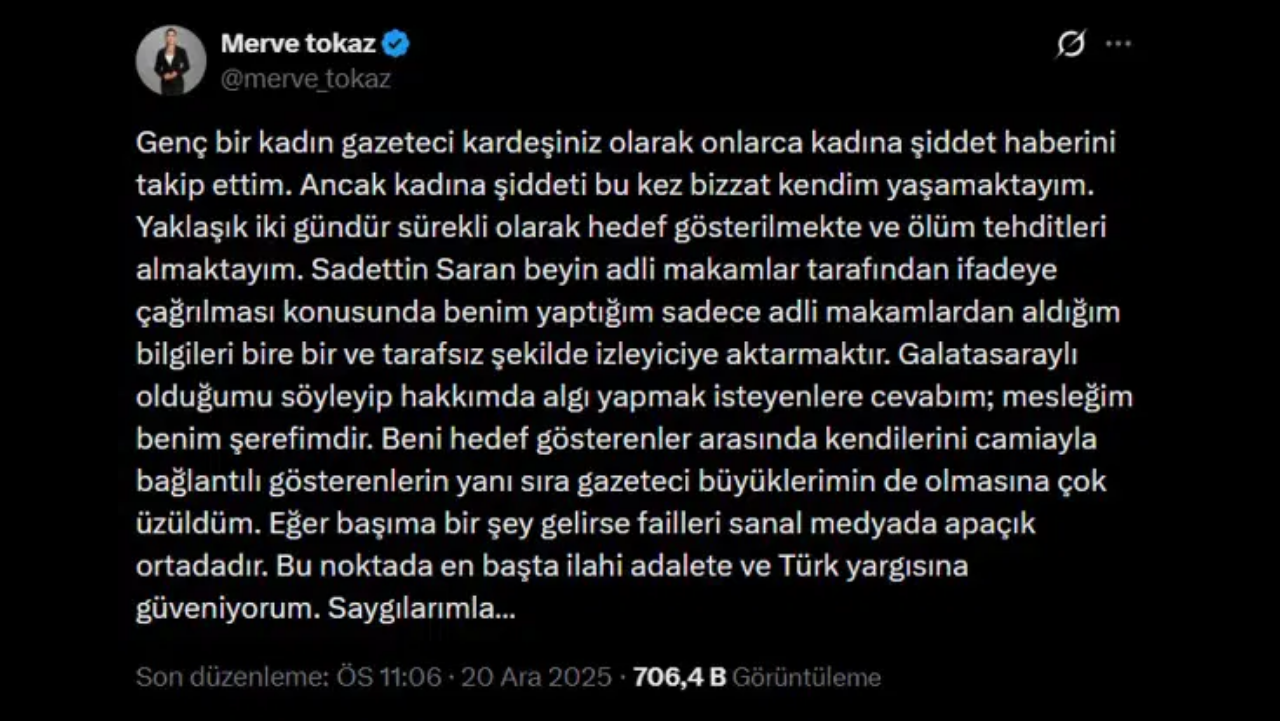 CNN Türk muhabiri Merve Tokaz, Fenerbahçe Spor Kulübü Başkanı Sadettin Saran’ın bir uyuşturucu operasyonu kapsamında ifadeye çağrılmasını konu alan haberinin ardından ölüm tehditleri aldığını açıkladı. Sosyal medya üzerinden hedef gösterildiğini belirten Tokaz, yaklaşık iki gündür tehdit mesajlarıyla karşı karşıya olduğunu söyledi. Yaptığı haberlerde yalnızca adli makamlardan aldığı bilgileri, tarafsız ve bire bir şekilde aktardığını vurgulayan Tokaz, yaşananların gazetecilik faaliyeti nedeniyle gerçekleştiğine dikkat çekti.