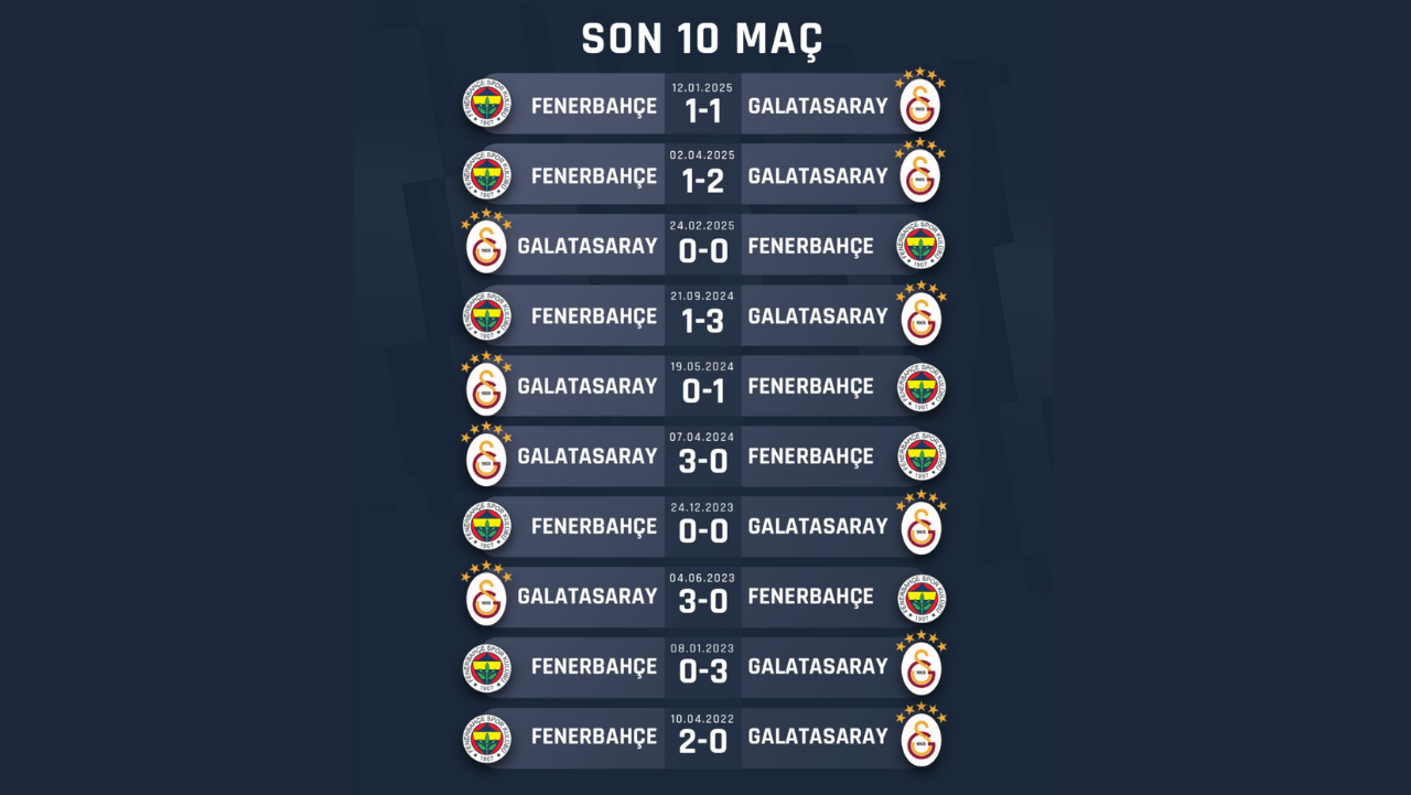 Galatasaray ile Fenerbahçe arasında oynanan son 10 maçın sonuçları, derbilerin ne kadar kırılgan bir denge üzerinde oynandığını gösteriyor. Bu periyotta iki ekip de galibiyetler alırken, beraberlikler de önemli bir yer tutuyor. Özellikle 0-0 ve 1-1 biten maçlar, takımların zaman zaman temkinli bir oyun anlayışını benimsediğini ortaya koyuyor.