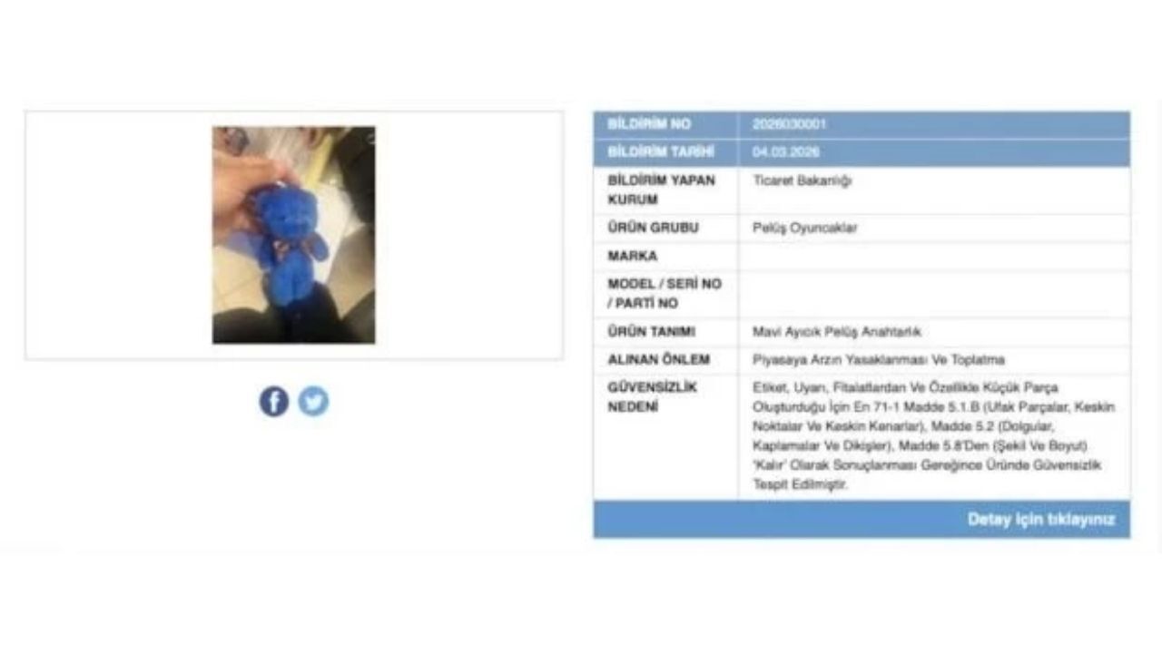 Toplatma kararına konu olan ürünün mavi ayıcık pelüş anahtarlık olduğu açıklandı. Yetkililer tarafından yapılan değerlendirmelerde ürünün hem kimyasal içerik bakımından mevzuata aykırı olduğu hem de küçük parçaları nedeniyle özellikle çocuklar için boğulma riski taşıdığı belirtildi.