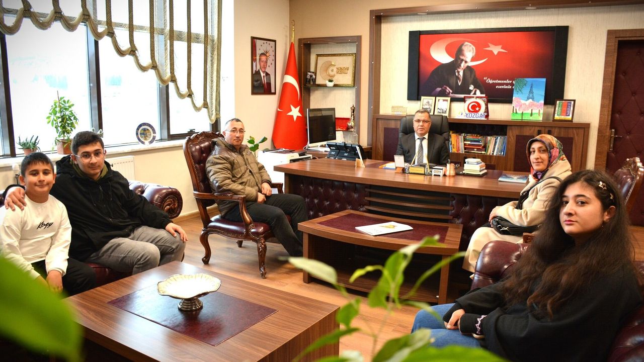 Yozgat Atatürk Anadolu Lisesi öğrencisi Ömer Başar Şahin, Nida Tüfekçi Güzel Sanatlar Lisesi öğrencimiz Elif Yaren Şahin ve Gazi Mustafa Kemal İlkokulu öğrencisi Muhammed Enes Şahin velileri ile birlikte Müdür İsmail Altınkaynak'ı makamında iade-i ziyaret etti.