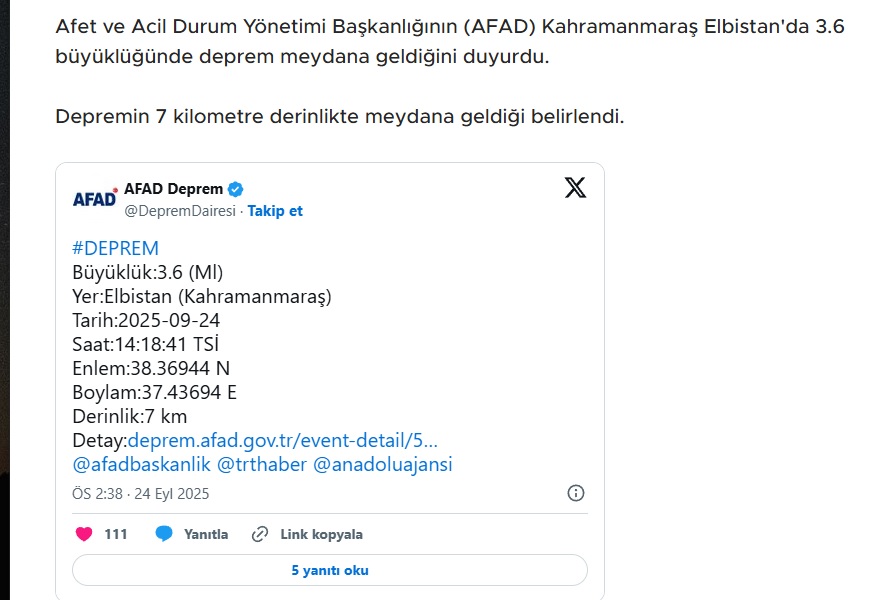 Afet ve Acil Durum Yönetimi Başkanlığı (AFAD), 24 Eylül 2025 Çarşamba günü saat 14.41’de Kahramanmaraş’ın Elbistan ilçesinde 3.6 büyüklüğünde bir depremin kaydedildiğini duyurdu. Depremin yerin 7 kilometre derinliğinde meydana geldiği bildirildi. Şu ana kadar olumsuz bir ihbar yapılmazken, sarsıntı çevre ilçelerde de hafif şekilde hissedildi.