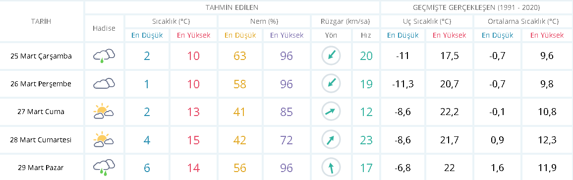 Meteoroloji Genel Müdürlüğü verilerine göre, 25 Mart 2026 Çarşamba günü kentte yağmur ve sağanak yağış bekleniyor.