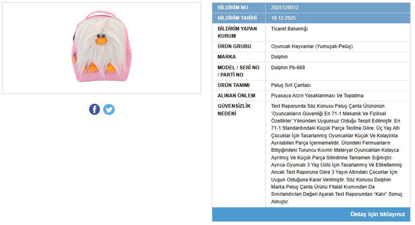 Yapılan incelemeler sonucunda Dolphin markasına ait bir pelüş sırt çantasının kullanımının güvensiz olduğu belirlendi. Bakanlık, ürünün ilgili teknik ve güvenlik kriterlerini karşılamadığını tespit etti. Bu doğrultuda söz konusu sırt çantasının satışının yasaklanmasına karar verildi. Ayrıca, piyasaya arz edilmiş olan ürünlerin toplatılması yönünde de işlem başlatıldı. Karar, tüketicilerin olası sağlık risklerinden korunması amacıyla alındı.