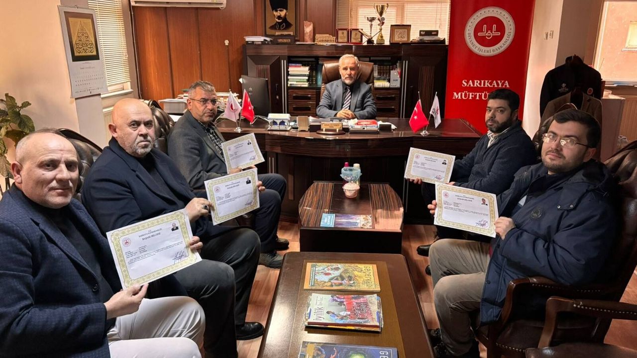 Sarıkaya Kaymakamı Mubin Demirkıran tarafından verilen başarı belgeleri, İlçe Müftüsü Zühdü Elveren tarafından din görevlilerine takdim edildi.