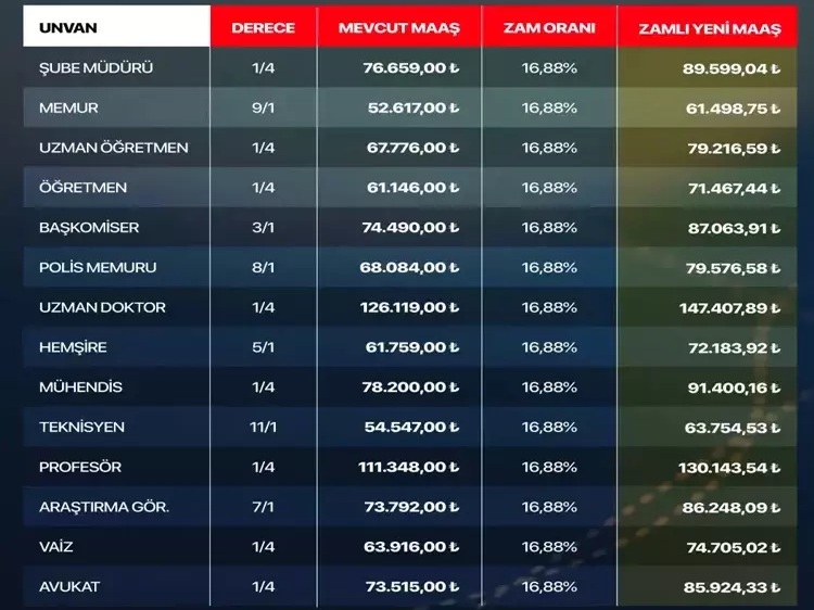 Açıklanan verilere göre çeşitli unvan ve derecelerde memurlar için 5 aylık enflasyon farkı üzerinden hesaplanan yeni maaşlar şöyle şekillendi: