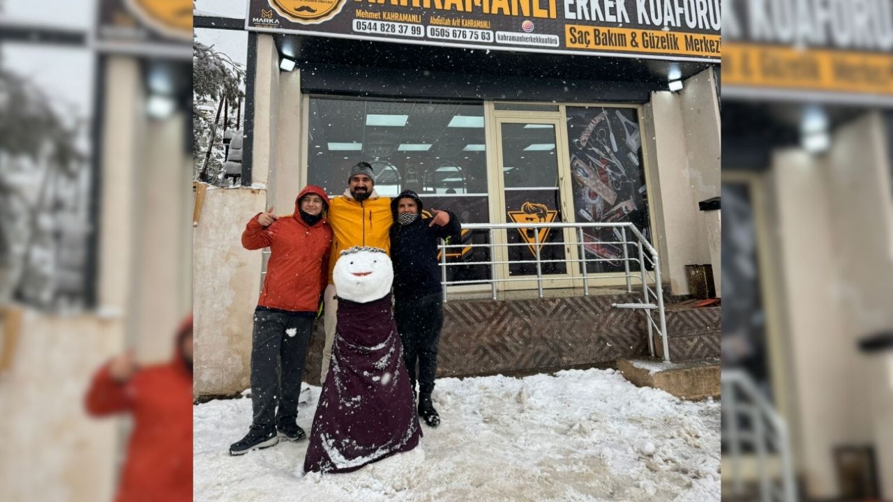Kar yağışının günlük hayatı olumsuz etkilediği İslahiye ilçesinde, yolların kapanması ve soğuk hava nedeniyle iş yerlerine müşteri gelmeyince ilginç bir uygulama hayata geçirildi. Mesleki Eğitim Merkezi öğrencisi Yusuf Yılmaz, uygulamalı eğitimini aksatmamak için iş yerinin önüne kardan adam yaptı. Kardan adamın başına peruk takan Yılmaz, “müşterisini” tıraş ederek eğitimini tamamladı.