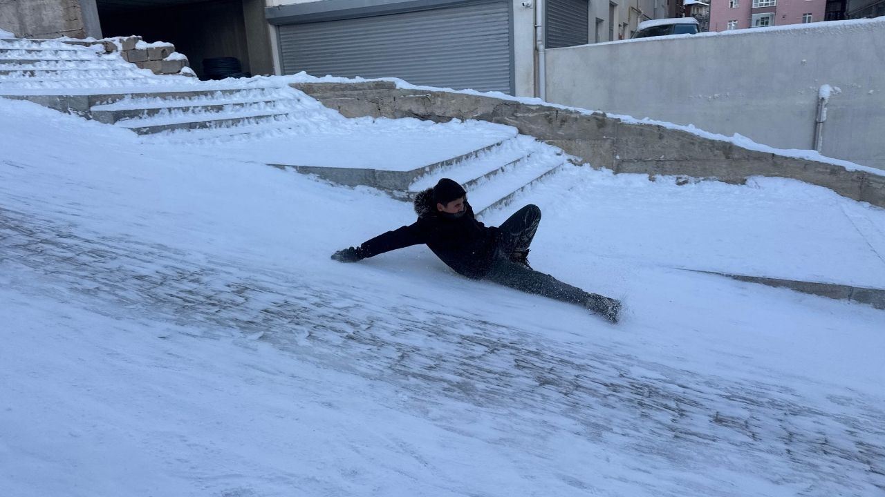 Muhammet Ali Müjdeci ise kayarken zaman zaman zorlandıklarını belirterek, “Poşet ve muşambalarla kayıyoruz. Biraz tehlikeli olsa da dengemizi kurmaya çalışıyoruz. Arkadaşlarımızla çok güzel vakit geçiriyoruz” ifadelerini kullandı.