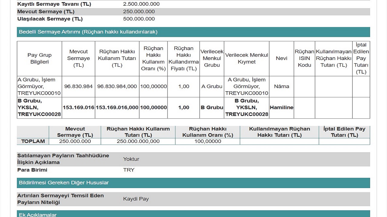 Rüçhan hakkı kullanım süreci 15 gün olarak uygulanacak. Bu süre dahilinde yatırımcılar ödemelerini yaparak yeni lotlarını alabilecek. Rüçhan hakkı kullanım süreci başlangıç ve bitiş tarihleri YKSLN KAP sayfası üzerinden yapılacak açıklama ile duyurulacak. Sürecin 2026 yılına kalmadan, Aralık ayı içerisinde tamamlanması bekleniyor.