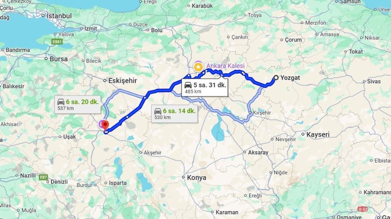 Yozgat’tan Afyon’a giderken en çok tercih edilen ve güvenli sayılan güzergah, Ankara üzerinden Eskişehir yolu oluyor. Bu rota şu şekilde ilerliyor: