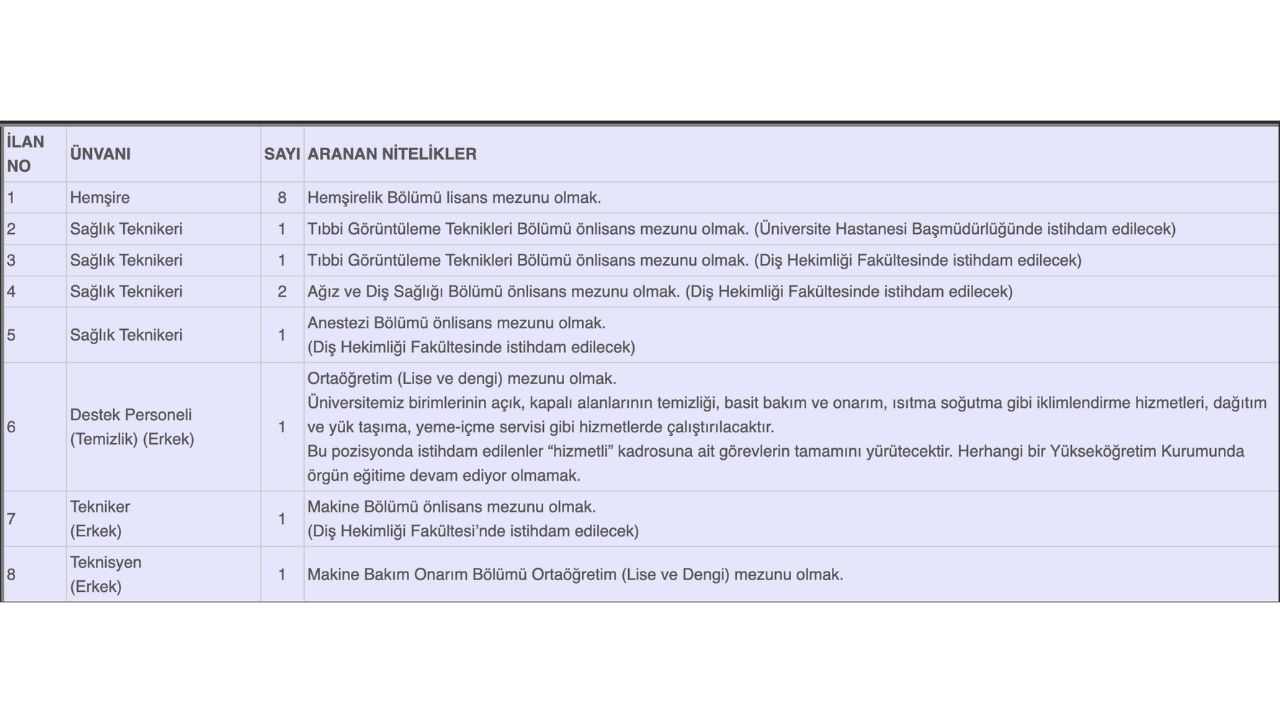 - Sağlık Teknikeri (5 kişi): Tıbbi Görüntüleme Teknikleri, Ağız ve Diş Sağlığı ve Anestezi bölümlerinden önlisans mezunu olmak. Bu pozisyonlar Üniversite Hastanesi Başmüdürlüğü ve Diş Hekimliği Fakültesi'nde istihdam edilecek.