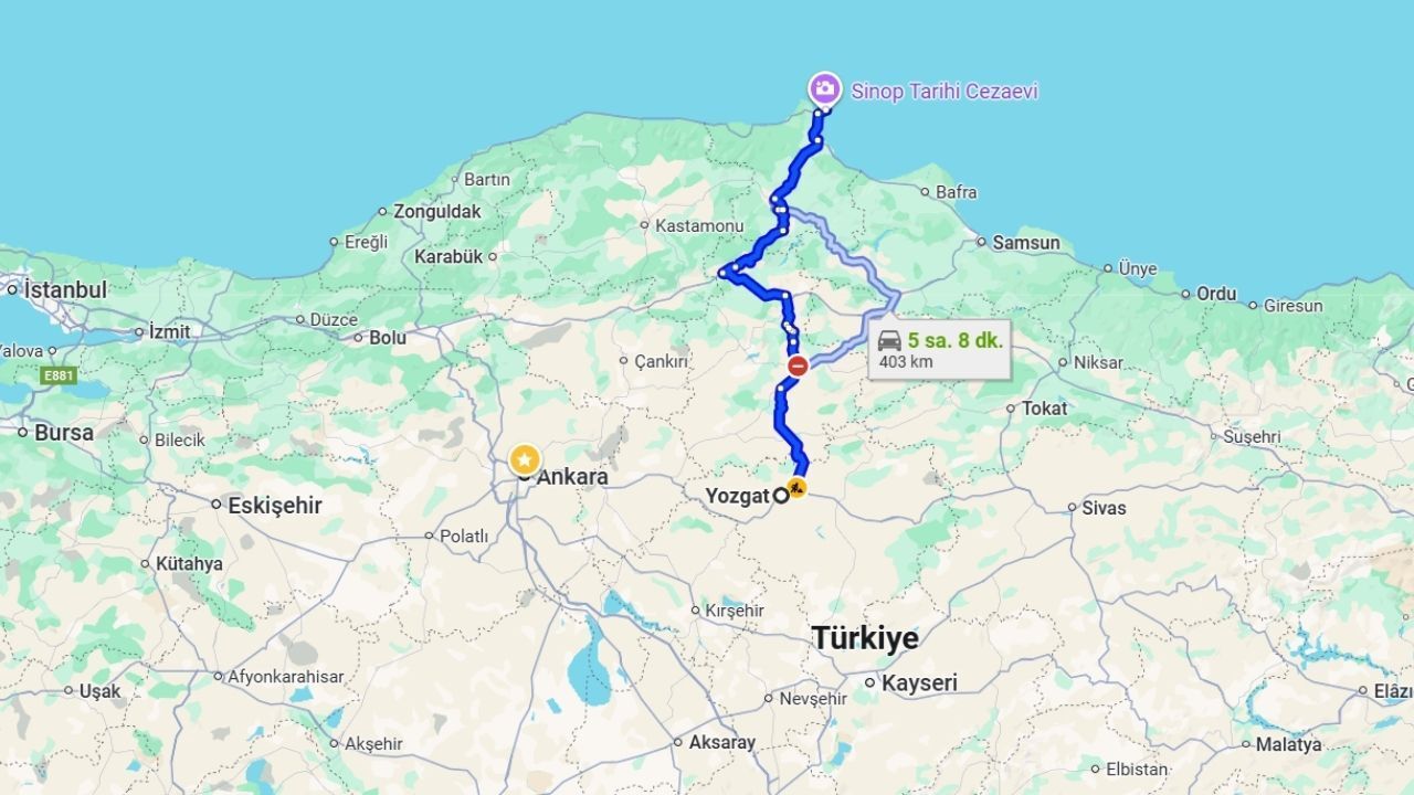 Yozgat ile Sinop arasındaki mesafe D795 üzerinden yaklaşık 375 kilometre. Özel araçla bu yolculuk ortalama 5 ila 6 saat sürüyor. Otobüs ile seyahat edenler için süre biraz daha uzayabiliyor ve 7-8 saate kadar çıkabiliyor.