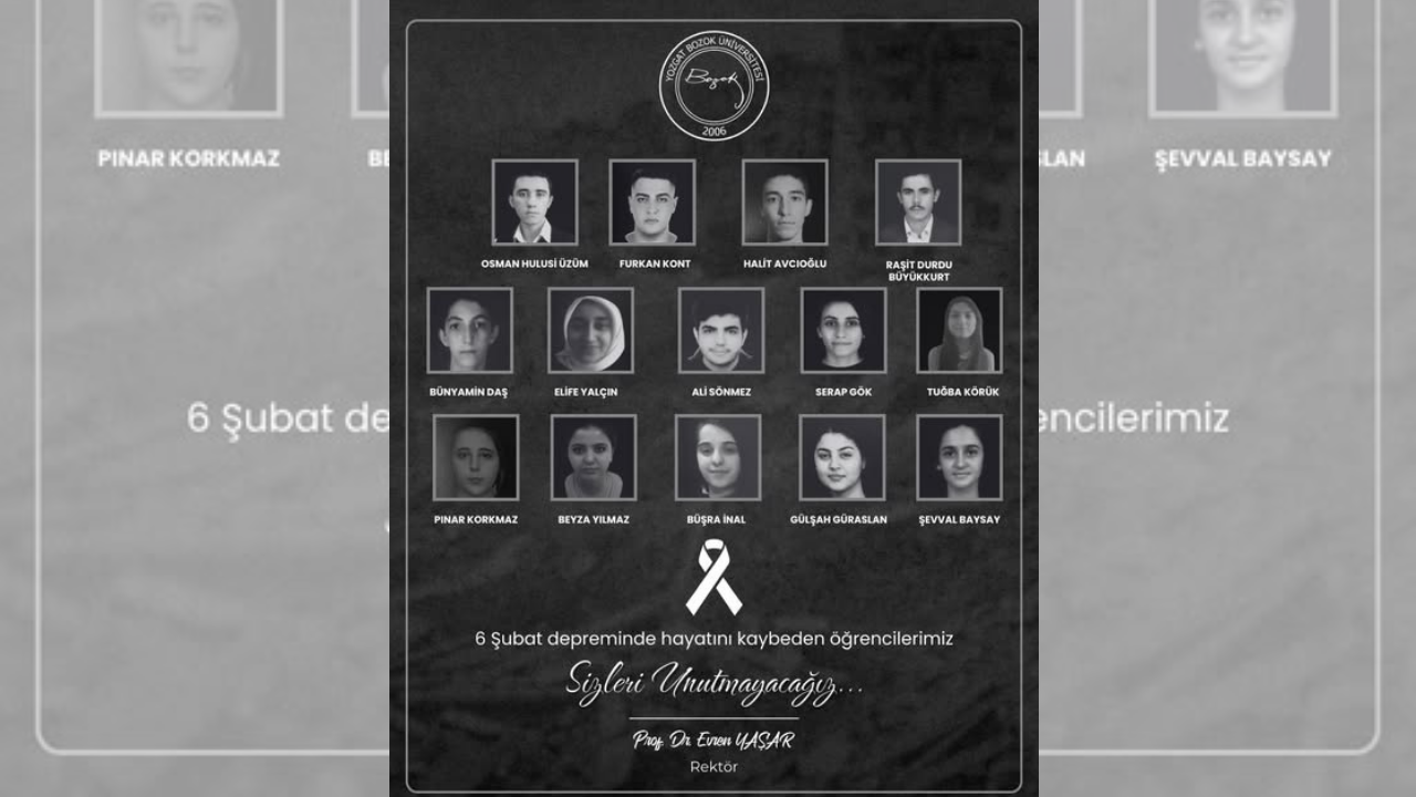 Yozgat Bozok Üniversitesi, 6 Şubat 2023’te Türkiye’yi derinden sarsan Kahramanmaraş merkezli depremlerde yaşamını yitiren öğrencilerini unutmadı. Üniversite tarafından paylaşılan anma görseli aradan geçen zamana rağmen acının ve kaybın tazeliğini bir kez daha hatırlattı. Hayatlarının baharında, eğitim hayalleri yarım kalan öğrenciler için yapılan bu anma, yalnızca bir hatırlatma değil, aynı zamanda ortak bir hafızanın, dayanışmanın ve vefanın ifadesi olarak öne çıktı.