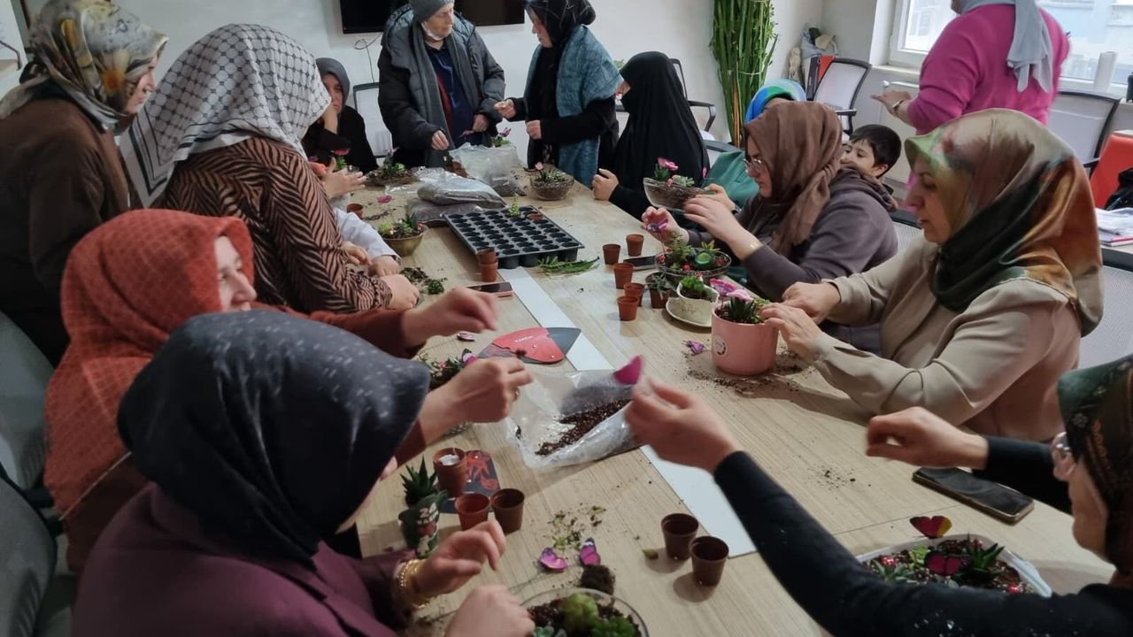 Etkinlikte, butik kaktüs üreticisi Kamile Sağlam ile Peyzaj Mimarı Yasemin Güçlü, katılımcı kadınlara bitki tasarımının inceliklerini uygulamalı olarak anlattı.